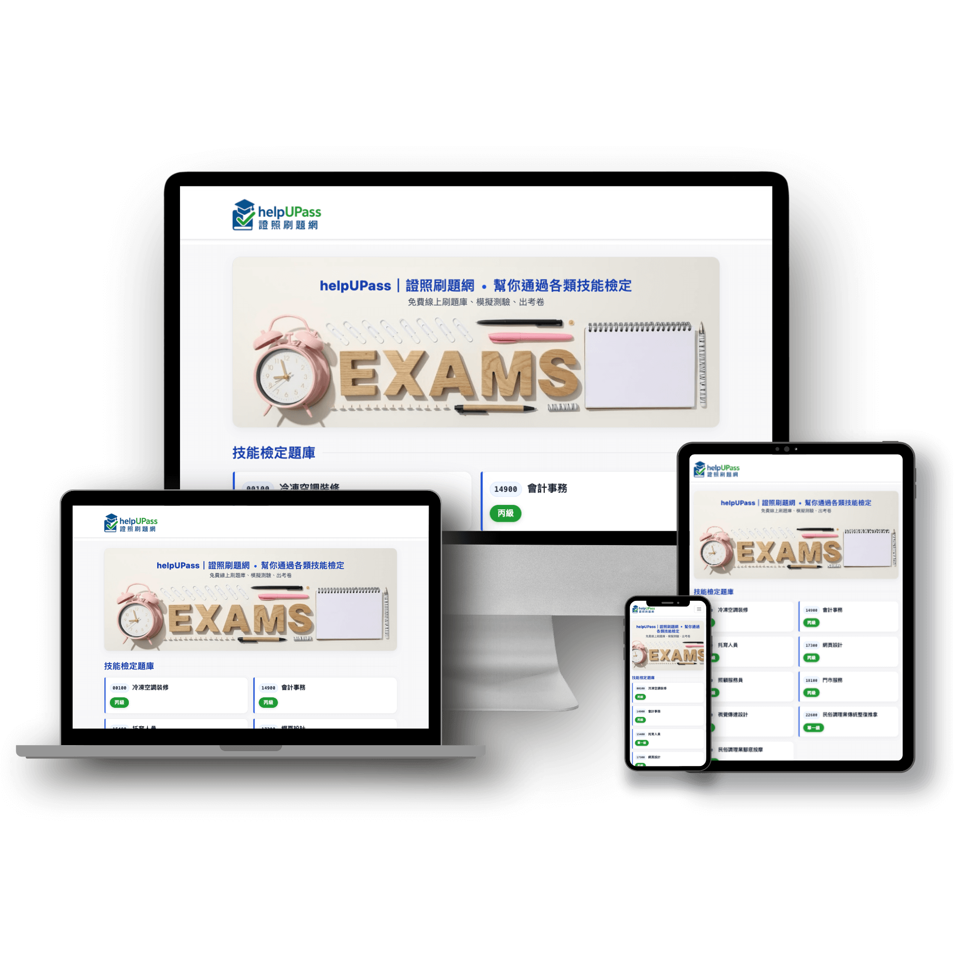 HelpUPass|證照刷題網為一個專為技能檢定與專業證照考試所建構的線上學習平台,提供免費題庫刷題、模擬測驗與出考卷功能,協助考生有效準備各類技能檢定。透過系統化題庫整理與實戰模擬機制,讓使用者能隨時隨地練習題目、掌握重點、熟悉考試節奏,提升應試信心與通過率。本專案從零開始規劃網站架構與功能邏輯,打造兼具實用性與學習效率的數位學習工具,協助更多考生順利通過考試。