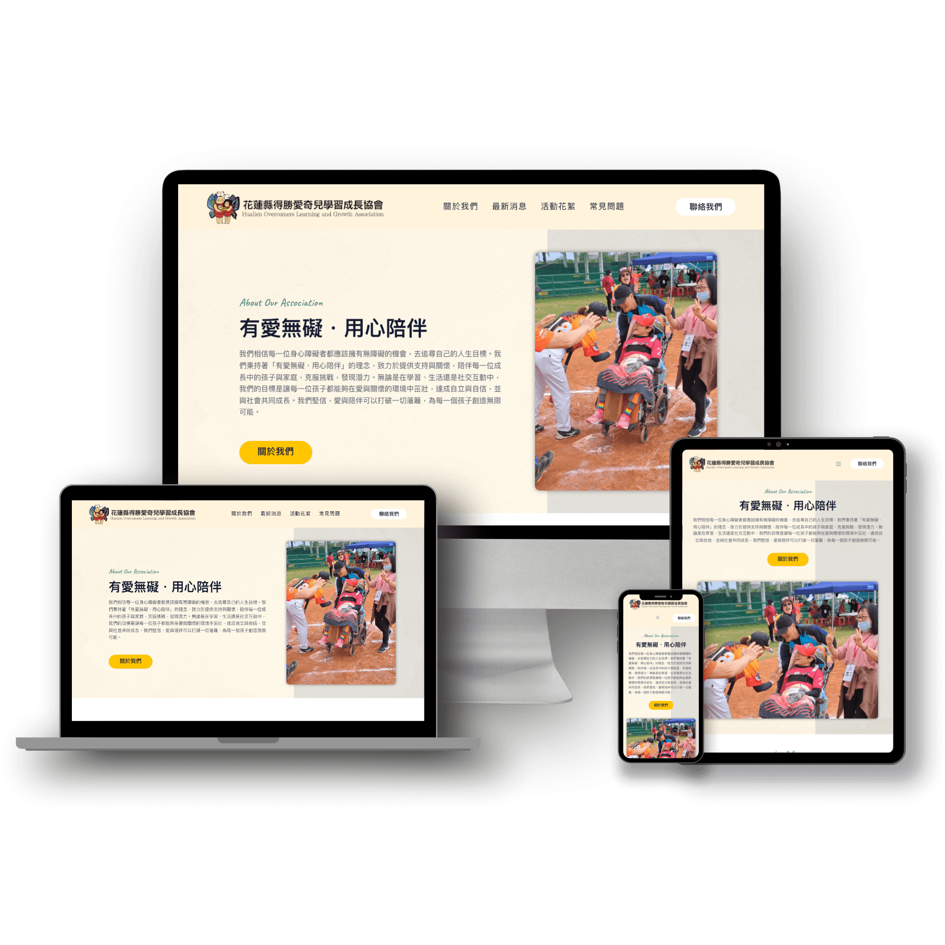 花蓮縣得勝愛奇兒學習成長協會起源於 2021 年夏天,由來自美國的牧師威樂義、何莉安夫婦帶著兒子參與美國得勝者棒球聯盟活動後,將理念帶回台灣,與花蓮當地身心障礙兒童家長與志工共同籌辦台灣得勝者棒球聯盟,並成功完成首屆棒球活動。孩子們在球場上的笑容,成為家長與志工持續投入的動力,最終於 2023 年正式立案成立協會。本專案建置全新官方網站,清楚呈現協會理念與服務內容,包括特殊需求運動機會、志工陪伴指導、家庭共融交流與免費活動支持,展現「有愛無礙,用心陪伴」的公益精神。